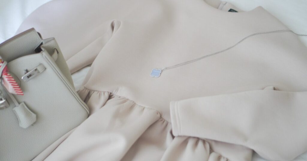 ペールピンクやミルクティーカラーのトップスにも違和感なくなじみます。むしろ、暖かみのある服を合わせることで、カルセドニーの透明感がより際立ち、全体が柔らかくまとまるんです。