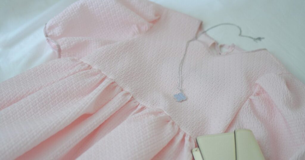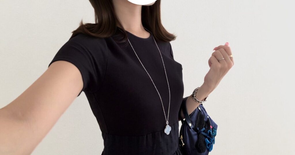 このペンダントを身につける日は、つい服の色で遊びたくなります。春夏ならホワイトやペールピンクのトップスと合わせて、全体を軽やかに。