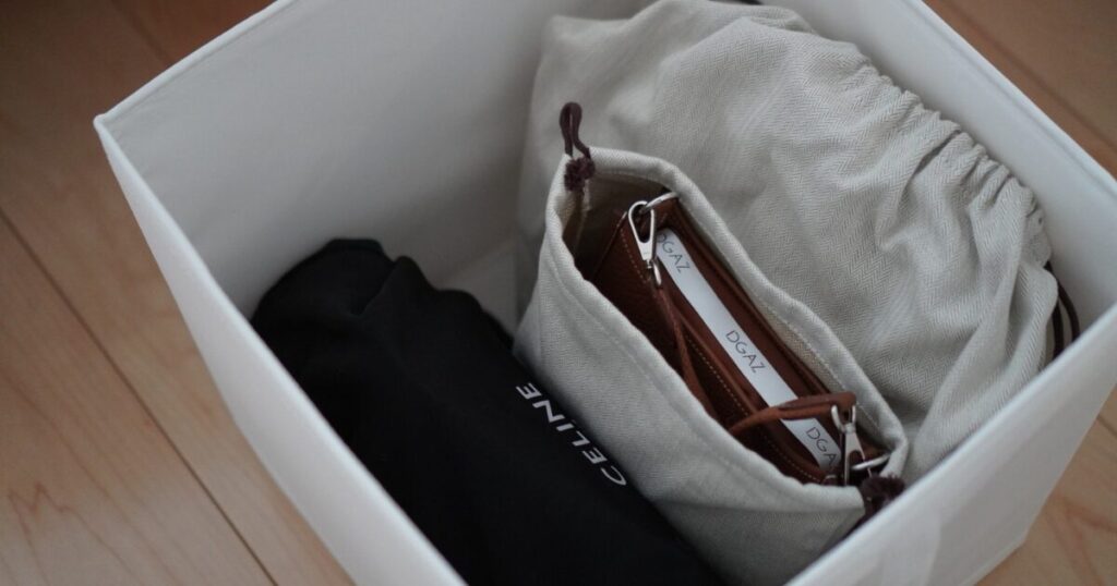 そこで今回は、IKEAのスクップボックスにバッグを立てて収納する方法に落ち着きました。