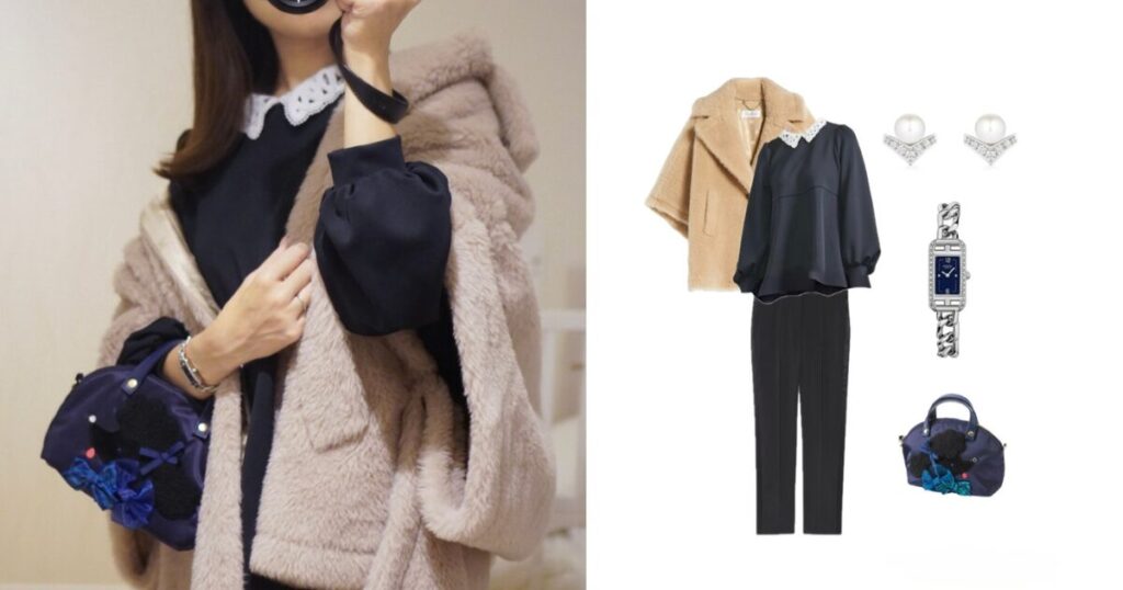 Max Maraのテディベアケープをポイントに、ネイビー基調でまとめた送迎コーデ。